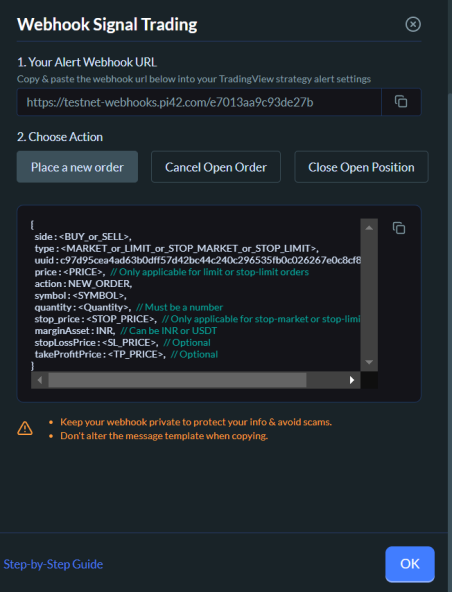 You will see a Webhook URL and messages for different actions like Place order, or cancel open order or close position.